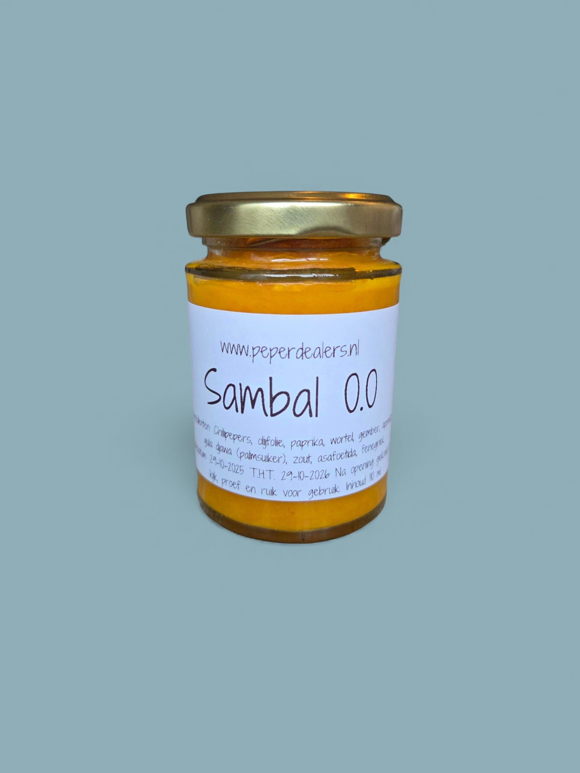 Chilipepers(Numex Suave Orange), olijfolie, gele paprika, wortel, gember, appelazijn, gula djawa (palmsuiker), zout, asafoetida(met fenegriek).
